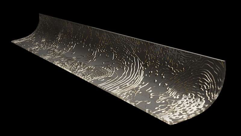 Texture: wave, concave with embeddings | Surface: gold leaf | Dimensions: 2,500 mm x 1,000 mm, curved